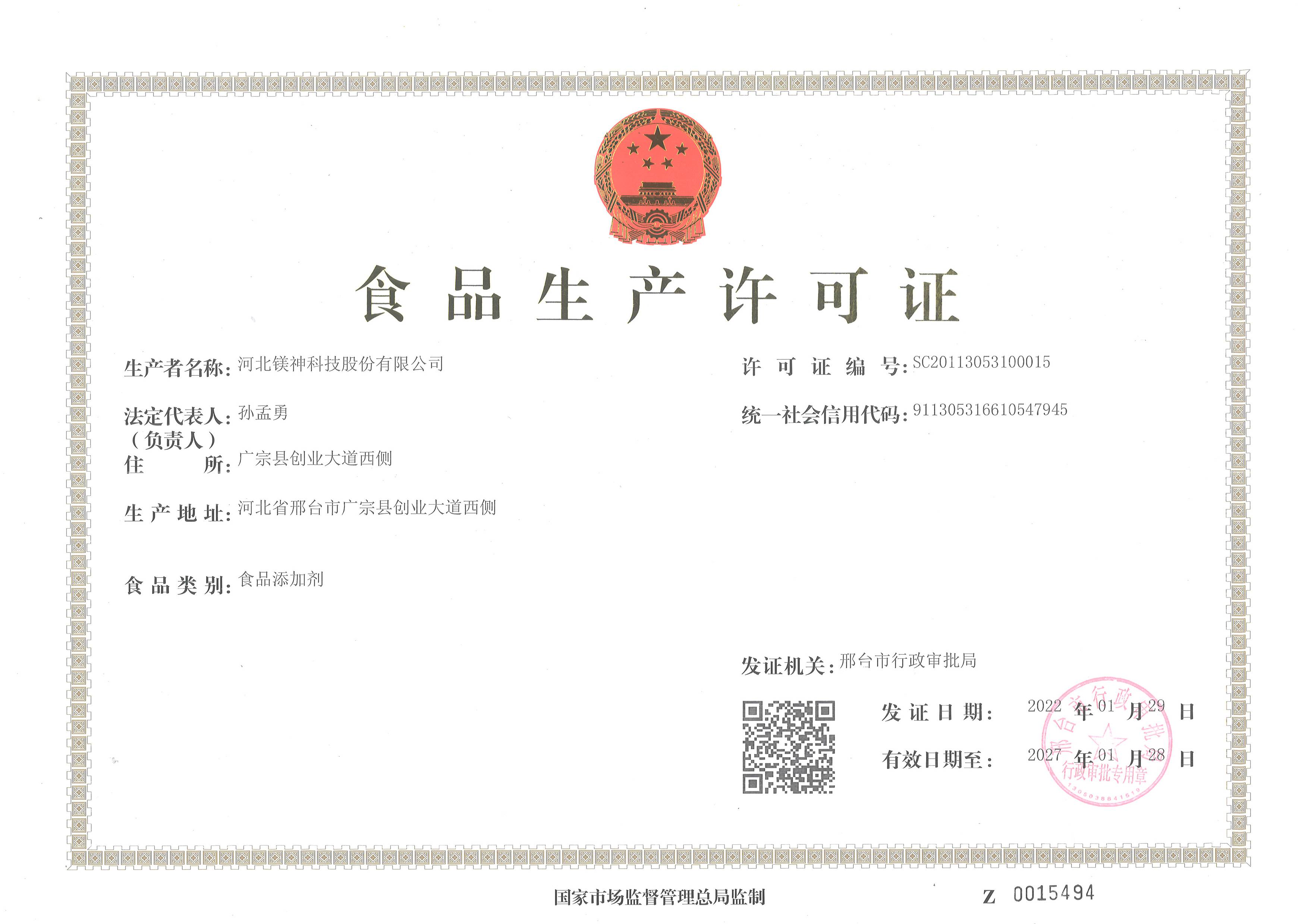 冶金鎂業(yè)食品生產(chǎn)許可證正本