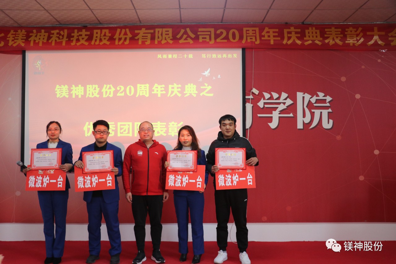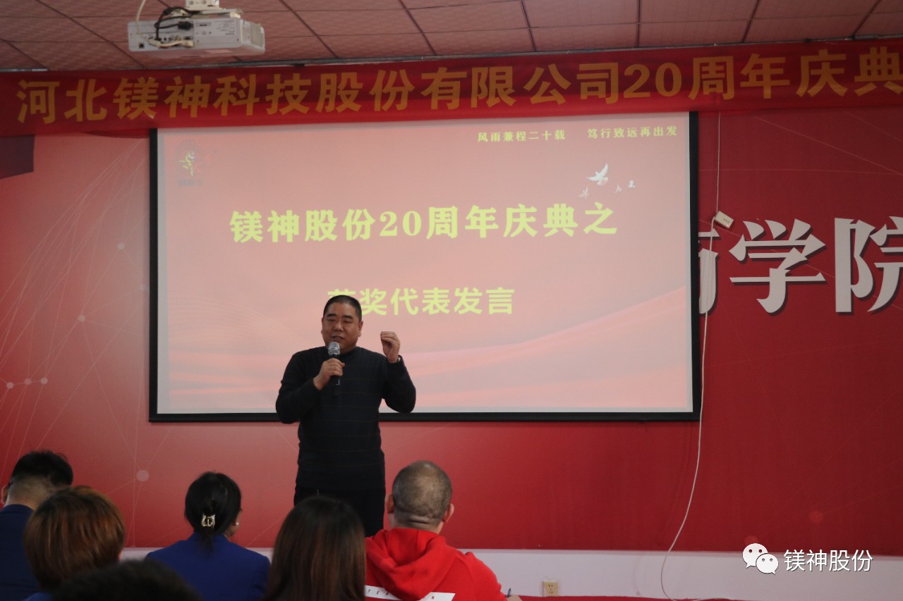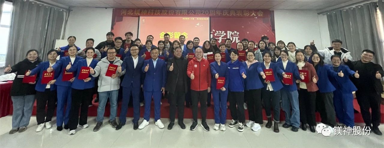 2023年10月,我們先后舉行了老員工表彰大會、“創新引領發展,應用贏得未來”中國鎂鹽協會技術論壇暨鎂神科技20周年慶典、“合作共贏、攜手未來”河北鎂神科技股份有限公司20周年慶典暨大客戶交流活動。