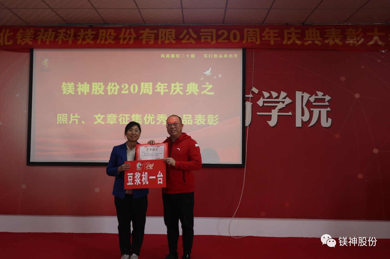 與慶典表彰大會一同舉辦的還有二十周年慶相關征文活動頒獎典禮。海南公司員工李紅嬌的作品“獻給鎂神二十周年”拔得頭籌。