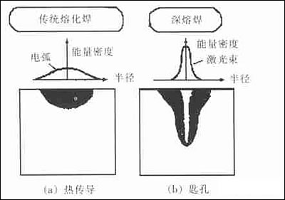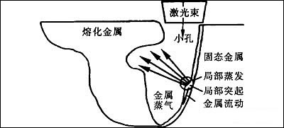 在焊接大厚度鋁合金時(shí),傳統(tǒng)的焊接方法根本不可能單道焊透,而激光深熔焊時(shí)形成大深度的匙孔,發(fā)生匙孔效應(yīng),則可以得到實(shí)現(xiàn)。圖1為激光焊接時(shí)的小孔形狀。圖2為激光深熔焊示意圖。