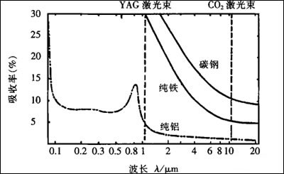鋁及鋁合金的激光焊接難點(diǎn)在于鋁及鋁合金對(duì)輻射能的吸收很弱,對(duì)CO2激光束(波長(zhǎng)為10.6m)表面初始吸收率1.7%;對(duì)YAG激光束(波長(zhǎng)為1.06m)吸收率近5%。圖3為不同金屬對(duì)激光的吸收率。