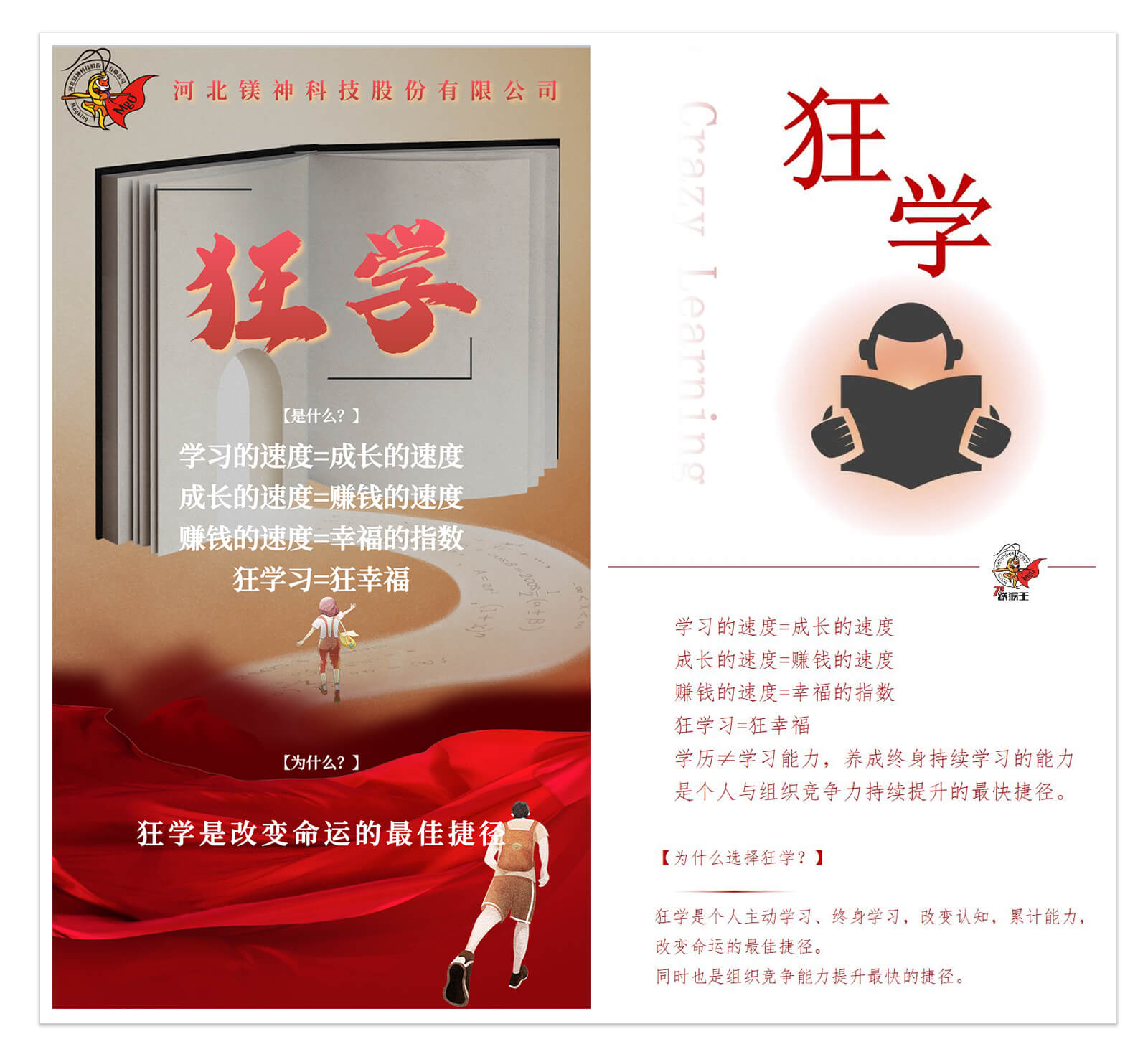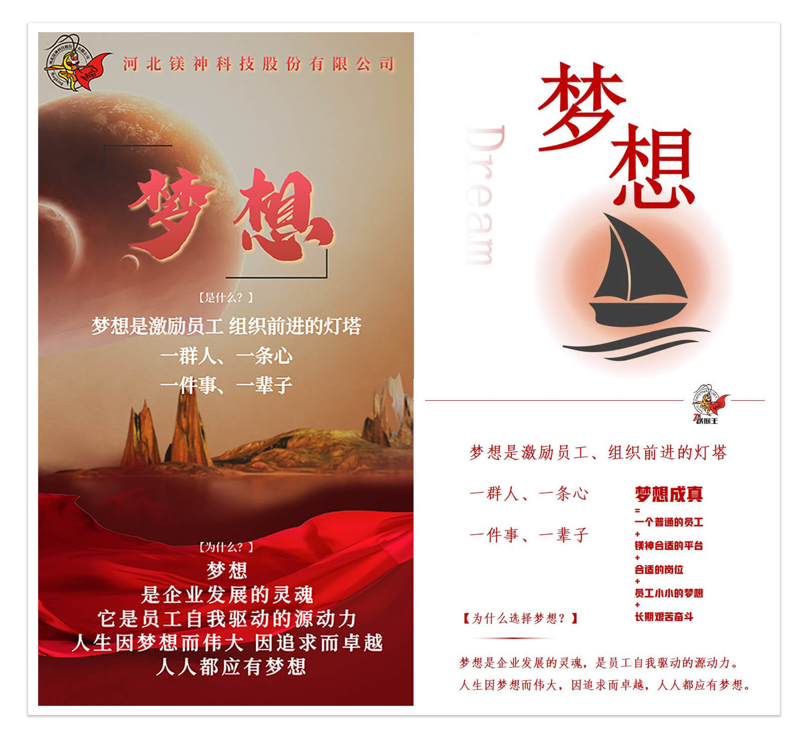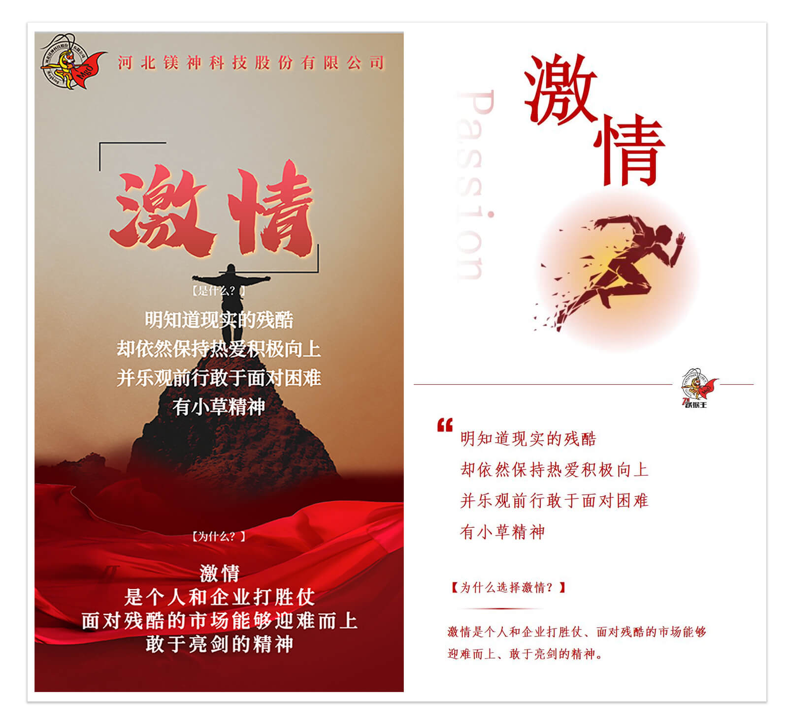 鎂神科技以創(chuàng)辦實業(yè),發(fā)展經(jīng)濟(jì),造福一方,共同富裕為初心;秉承著為全球用戶提供更適合的氧化鎂,為人類健康、科技創(chuàng)新、可持續(xù)發(fā)展作出貢獻(xiàn)的使命;有著創(chuàng)建百年鎂神平臺,讓客戶、員工、股東共同發(fā)展、共同快樂、共同富裕的美好愿景;培育出拼搏、堅韌、越挫越勇的鎂神人。鎂神人用誠信、激情、夢想、狂學(xué)、內(nèi)省、溝通、合作、創(chuàng)新、利他的價值觀向客戶、社會各界朋友詮釋著鎂神的企業(yè)文化!